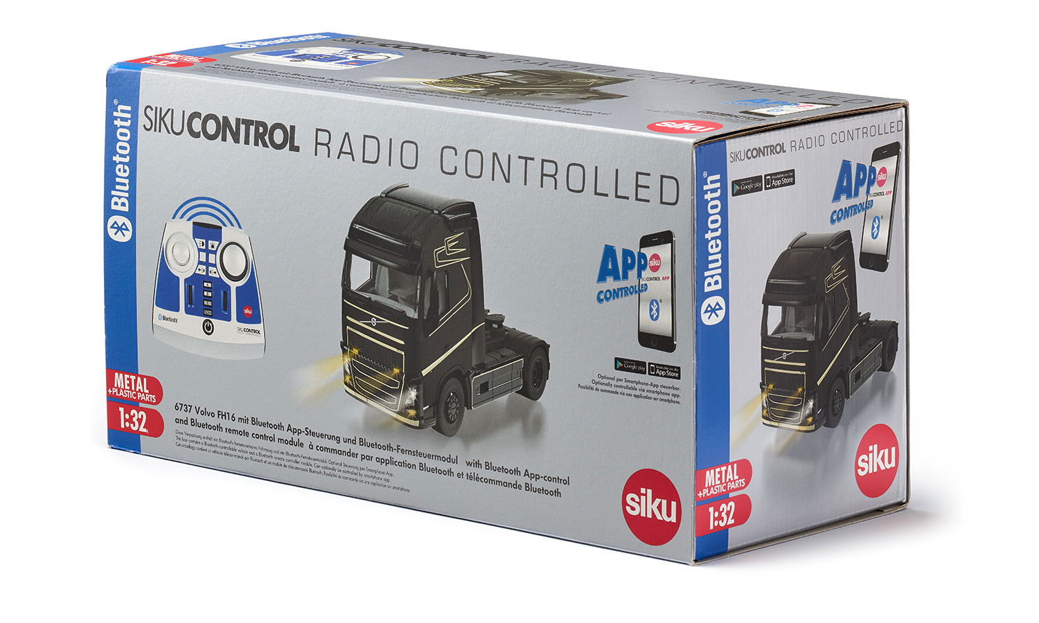 Schweden-Truck mit App steuernPower, Detailliertheit, hohe Funktionalität - und das alles mit Smartphone oder Tablet zu steuern. Dies bietet der neue SIKUCONTROL Volvo FH16 4x2. Die SIKU APP und die Bluetooth-Technologie machen es möglich. Die vielen Funktionen der Zugmaschine aus Schweden versprechen Spielspaß. Der SIKUCONTROL Truck aus Metall und Kunststoff zeichnet sich nicht nur durch die zahlreichen Features aus, sondern auch durch die bei Fans so geschätzte Detailliebe. Das Fahrerhaus aus Metall ist in Mattschwarz lackiert und aufwändig bedruckt. Alle Funktionen und die zwei Getriebe des Volvo FH16 4x2 werden über die App gesteuert. Wahlweise über die virtuelle Joystick-Steuerung oder die Bewegungs- und Neigungssensoren der mobilen Geräte. Dieses intuitive Feature ist eine willkommene Abwechslung und bietet zusätzlichen Spielspaß. Angetrieben wird der Volvo-Truck über eine Achse. Mit der App ist präzises Rangieren genauso möglich wie das An- und Abkoppeln des 3-Achs-Kippsattelaufliegers (Artikel 6734). Zudem ist in die Zugmaschine eine Datenbuchse integriert, um die Steuerbefehle an den Auflieger weiter zu geben. Alternativ zur SIKU APP kann der Volvo auch mit dem Bluetooth Fernsteuermodul gesteuert werden.