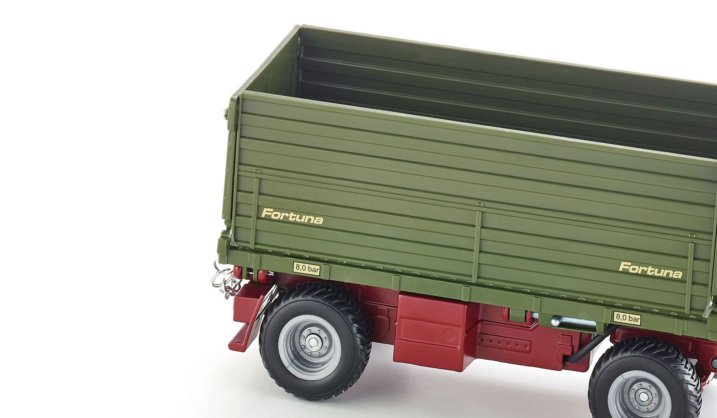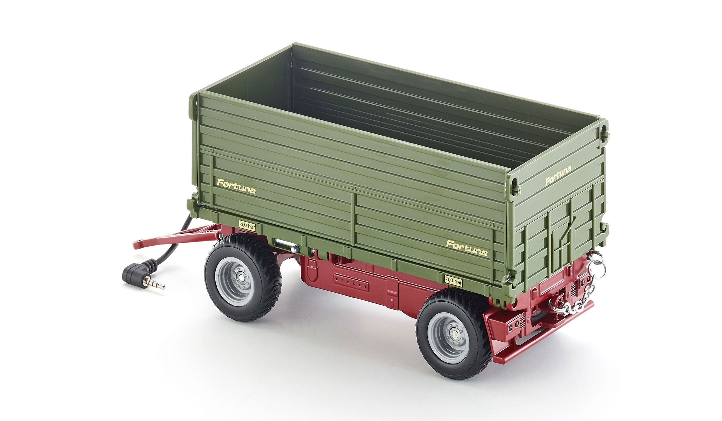 Remorque basculante à deux faces commandée électroniquement avec remorque savoyarde et timon. La remorque possède grâce à sa batterie une alimentation électrique propre et est reliée au tracteur avec un câble déchange de données. La trémie de la remorque peut être basculée électroniquement aussi bien vers la droite que vers la gauche. Il est possible ici dutiliser le module de télécommande déjà présent. Des DEL rouges et oranges font fonction de feux arrière et de clignotants dans le secteur arrière de la remorque. Grâce à son alimentation électrique propre, la remorque peut être utilisée sans le tracteur Control ou le module de télécommande. Des commutateurs correspondants sont prévus sur le modèle de manière à pouvoir diriger les fonctions de bascule et déclairage.