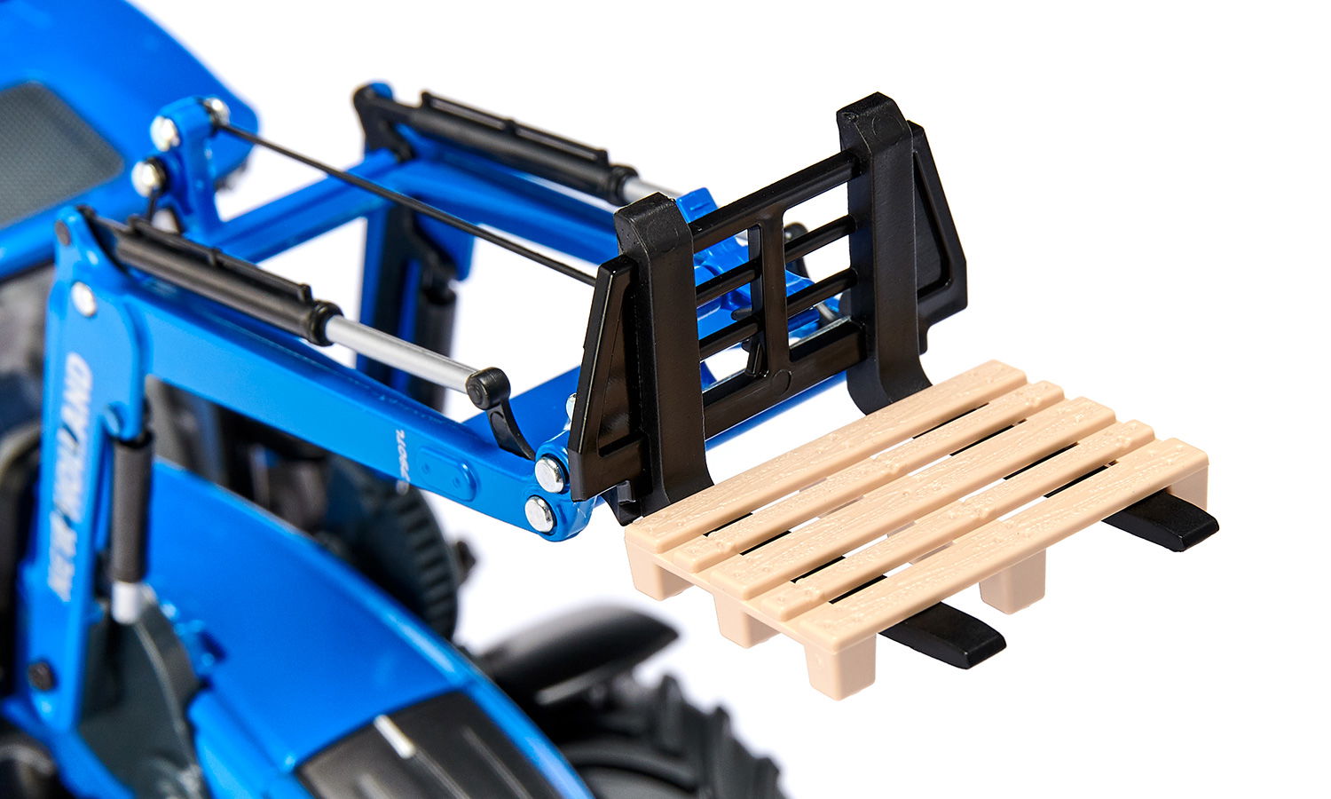 New Holland T7.315 to czołowy model w gamie ciężkich maszyn wyposażony w 6,7-litrowy sześciocylindrowy silnik i 313 KM. Mocny i oszczędny silnik sprawia, że ten duży traktor jest wszechstronny w polu i na drodze. Dzięki ładowaczowi czołowemu New Holland T7.315 może być solidnym narzędziem pracy w gospodarstwie. Pilot zdalnego sterowania SIKUCONTROL umożliwia sterowanie 5 biegami, 12 diodami LED i licznymi funkcjami, np. sterowanie tylnym sprzęgiem. Napęd na tylne koła i układ kierowniczy są sterowane proporcjonalnie. Ponadto ramię ładowacza czołowego i sam ładowacz można realistycznie przesuwać. Ramię załadowcze można również wyposażyć w widły do palet, przekształcając w ten sposób ładowacz czołowy w wózek widłowy. Podczas podnoszenia widły są automatycznie utrzymywane w poziomie. Za pomocą pilota zdalnego sterowania z Bluetooth można sterować wszystkimi traktorami SIKUCONTROL wyposażonymi w technologię Bluetooth. Sterowanie oferuje wiele profesjonalnych możliwości: skręcanie, prowadzenie pojazdu, elektroniczny tylny zaczep do urządzeń i przyczep, włączane światła mijania, włączane światła tylne i migacze, a także sterowanie wieloma ciągnikami za pomocą jednego pilota zdalnego sterowania.