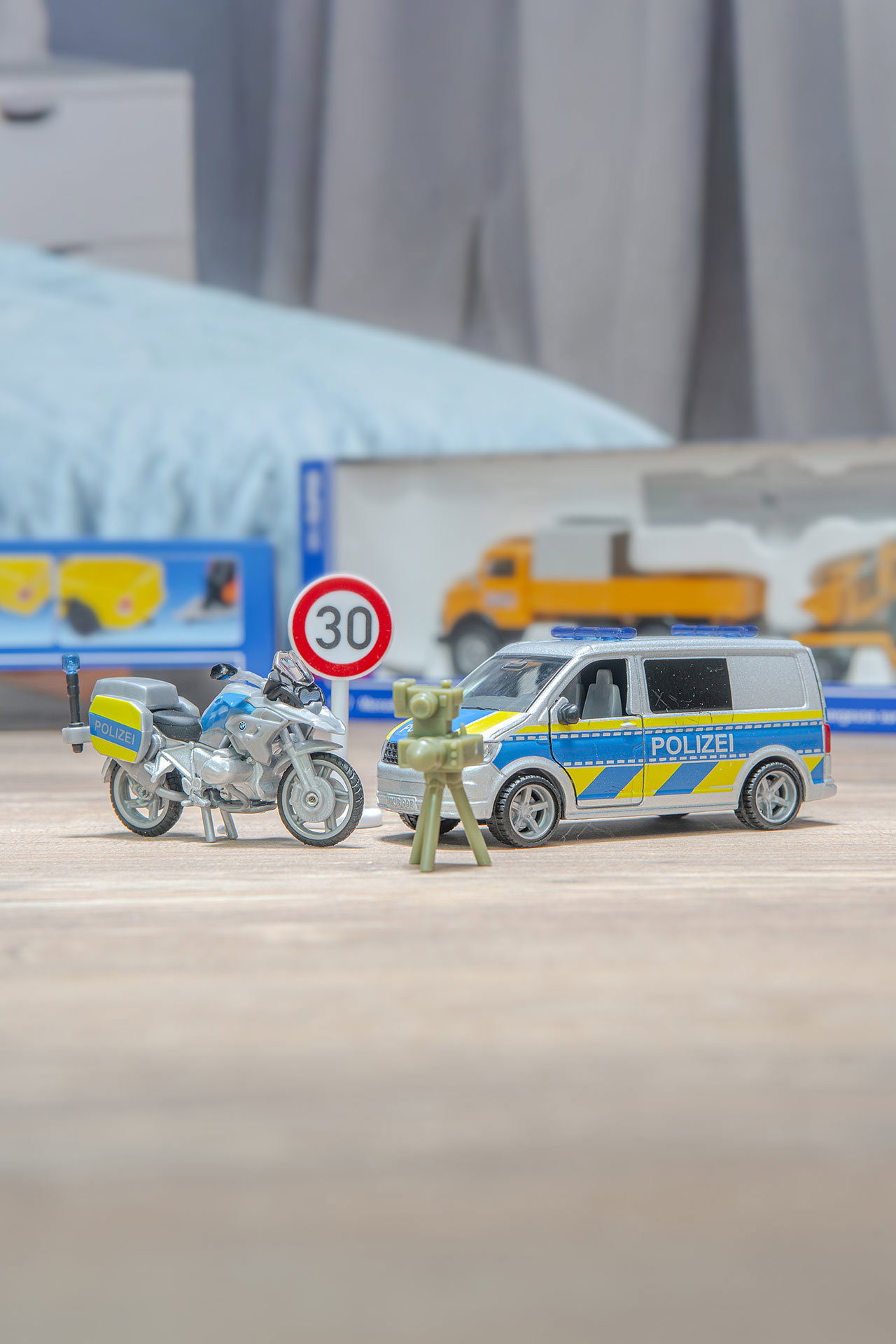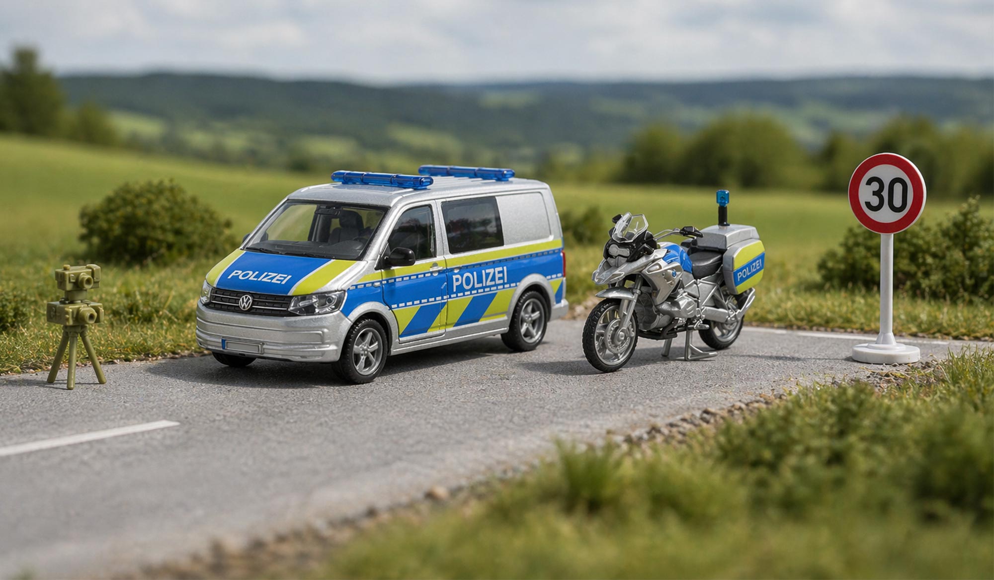 - Lieferumfang: VW T6, BMW Motorrad, 30er Tempolimitschild, Geschwindigkeitsmessgerät