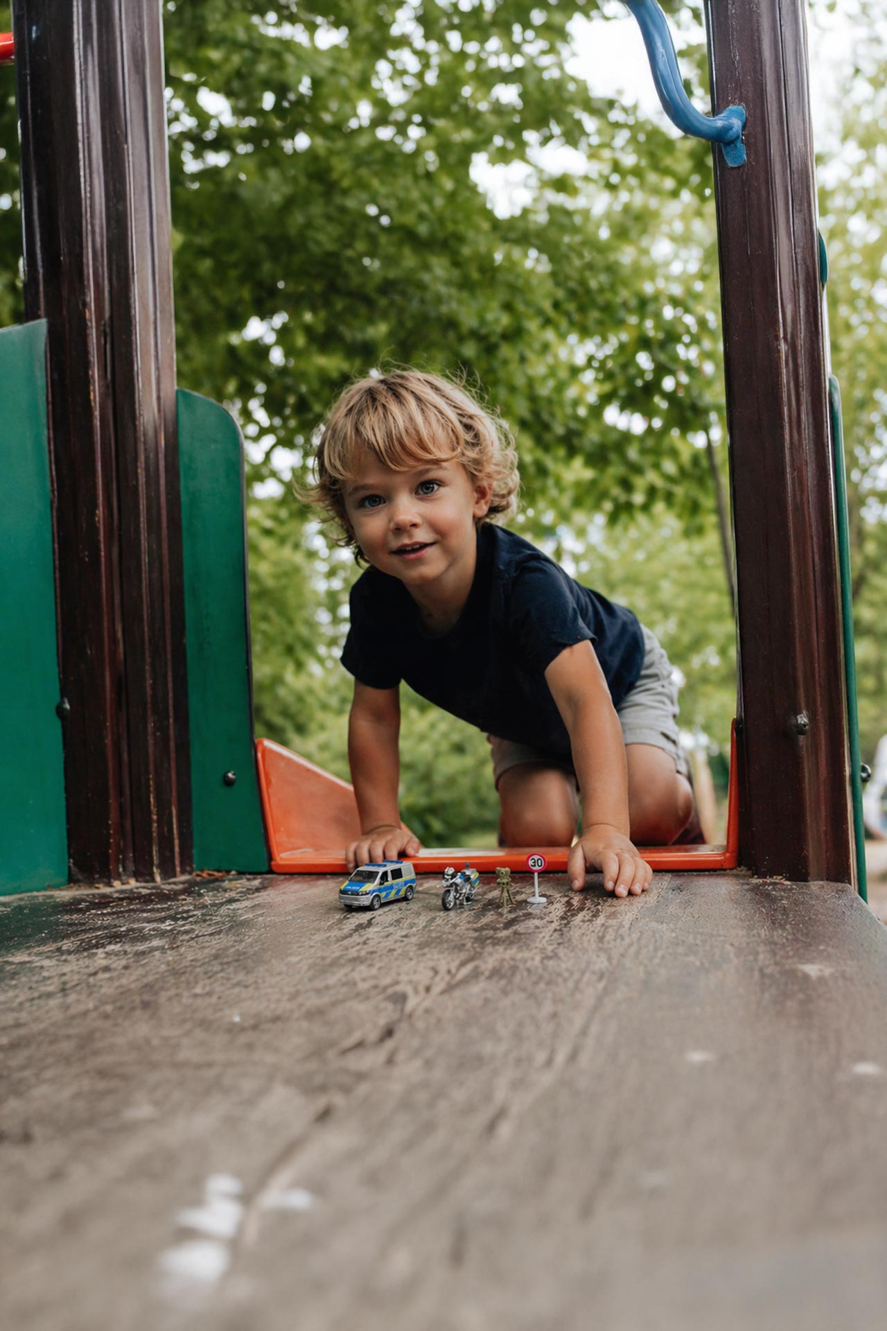 Kinder kontrollieren das Tempolimit, messen Geschwindigkeit mit dem Geschwindigkeitsmessgerät oder starten eine Verfolgungsjagd auf zwei und vier Rädern. Das Polizeimotorrad Spielzeugauto ergänzt das Polizeiauto ideal.